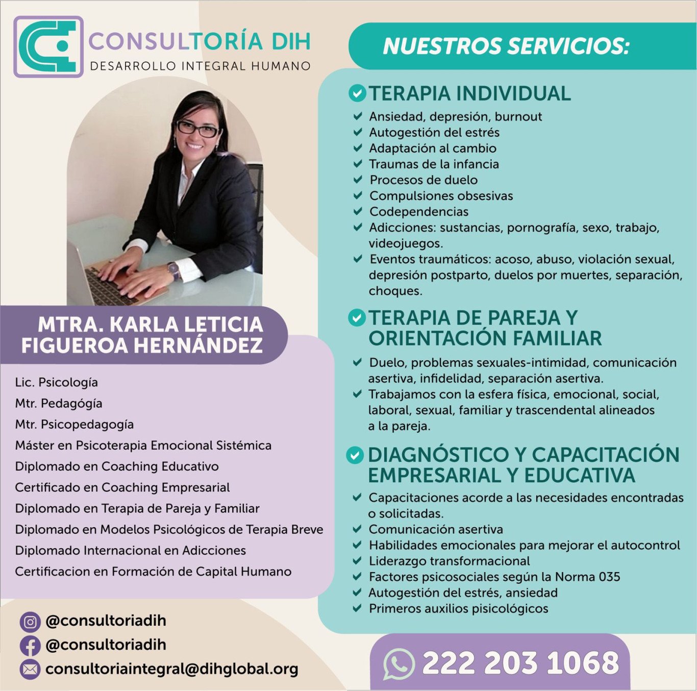 Consultoría DIH, Desarrollo Integral Humano, agradece la oportunidad de brindarte nuestros servicios de consultoría y psicoterapia, que, con más de 12 años de experiencia, busca innovar y trascender en los procesos, a través de evaluaciones diagnósticas, implementando estrategias personalizadas para recuperar tu salud mental y emocional. Como especialistas en la ayuda profesional de adolescentes y adultos, te garantizo un servicio humano, personalizado y con garantía de los resultados, entendiendo tus necesidades, siempre dispuesta a apoyarte.
