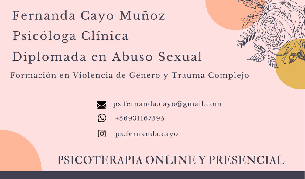 Como experiencia, realicé procesos terapéuticos con niños, adolescentes y adultos en el “Centro de Atención Psicológica USACH” en torno a temáticas asociadas con ansiedad, descontrol de impulsos, autoestima, dependencia emocional, violencia contra la mujer en contexto de pareja, depresión. Me especializo en abuso sexual, violencia de género, violencia en contexto de pareja y trauma complejo. Tengo formación en temáticas como el duelo, depresión, trastornos de pánico, dependencia emocional, ruptura de pareja, duelo, trastornos alimentarios , ansiedad generalizada, trauma, trauma complejo, violencia de género y abuso sexual. Me especialicé en la intervención y acompañamiento respecto al Trauma Complejo a través de el "Diplomado Trauma Complejo y Experiencia Traumática a lo largo del ciclo vital".