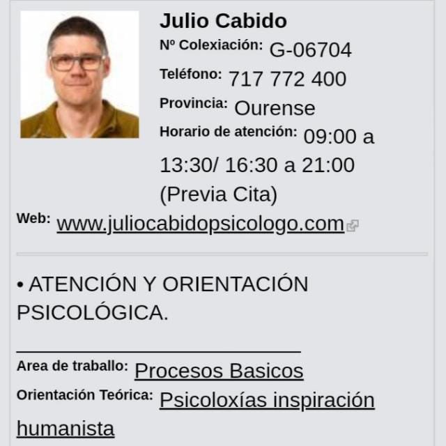 Mi nombre es Julio Cabido, soy Psicólogo, mi vocación es ayudarte. Mi trabajo se centra en la persona y en su personalidad. Intento que mi manera de trabajar sea una forma de ayudar a los demás en su desarrollo interior. Mi objetivo es aportar mi granito de arena para conseguir tus deseos de mejora. Y en este sentido, hago que mis terapias sean un proceso cálido y agradable, sin terapias agresivas ni formulismos. Me adapto al paciente y a cada situación personal, por tanto, no mantengo una misma estructura de trabajo para todos los casos. Siempre he pensado que la adaptación personalizada es la clave de la obtención de resultados. Y esa es mi manera de entender la Psicología.