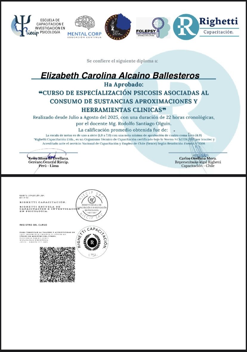 - Especialización psicosis asociadas al consumo de sustancias y herramientas clinica - Curso Formativo Righetti, Chile