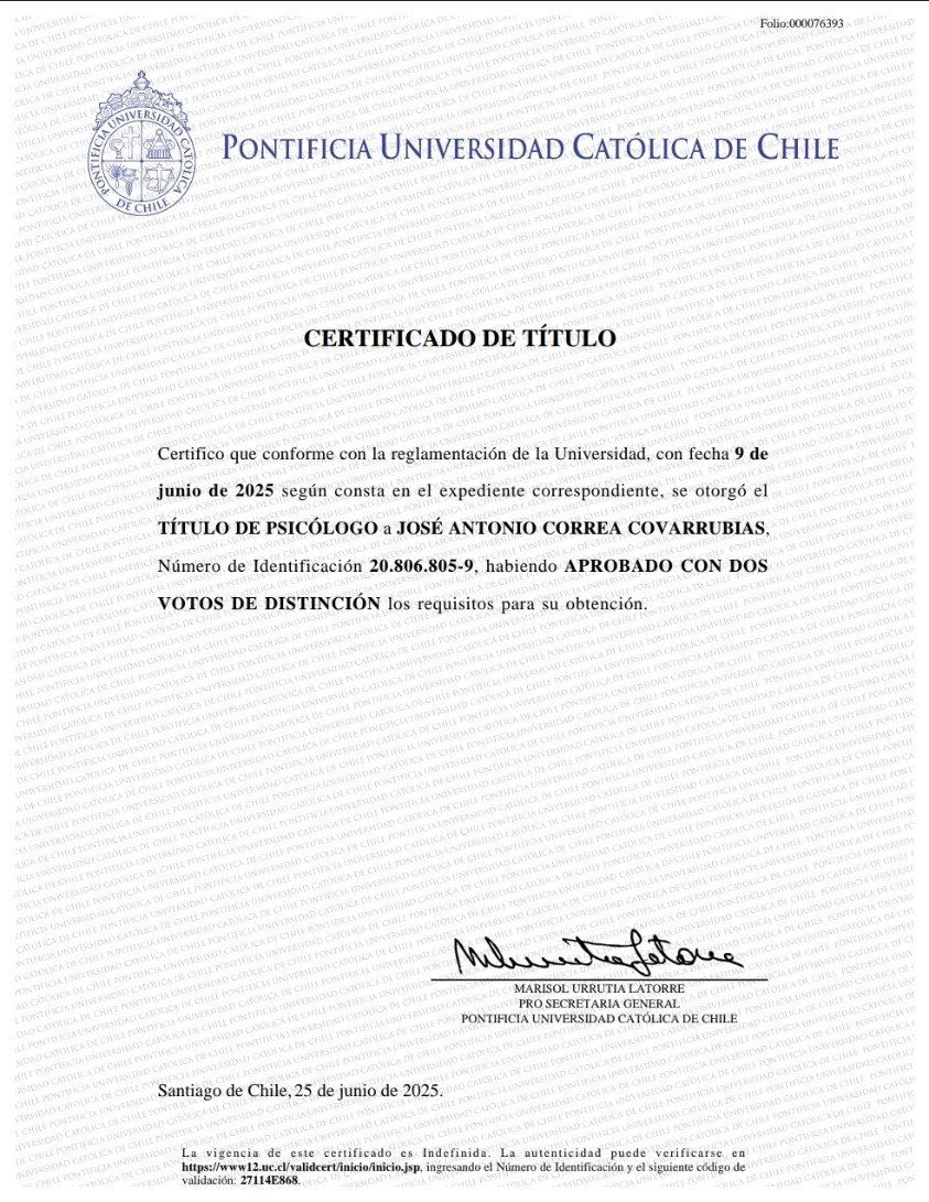 Psicólogo Clínico PUC, cursando Postitulo de Psicoterapia Psicoanalítica Focal.