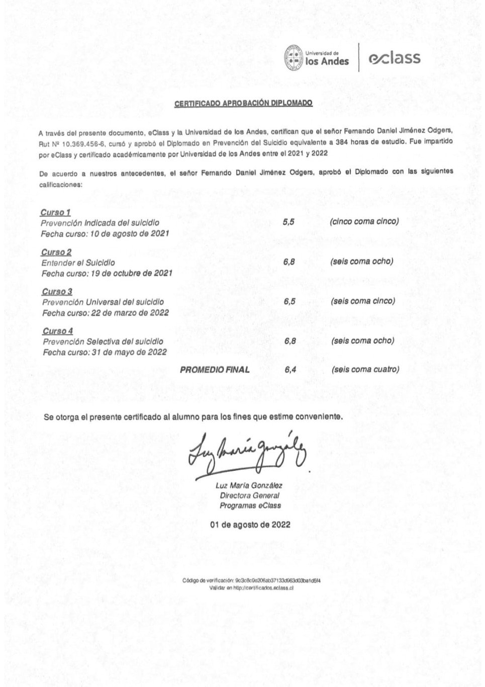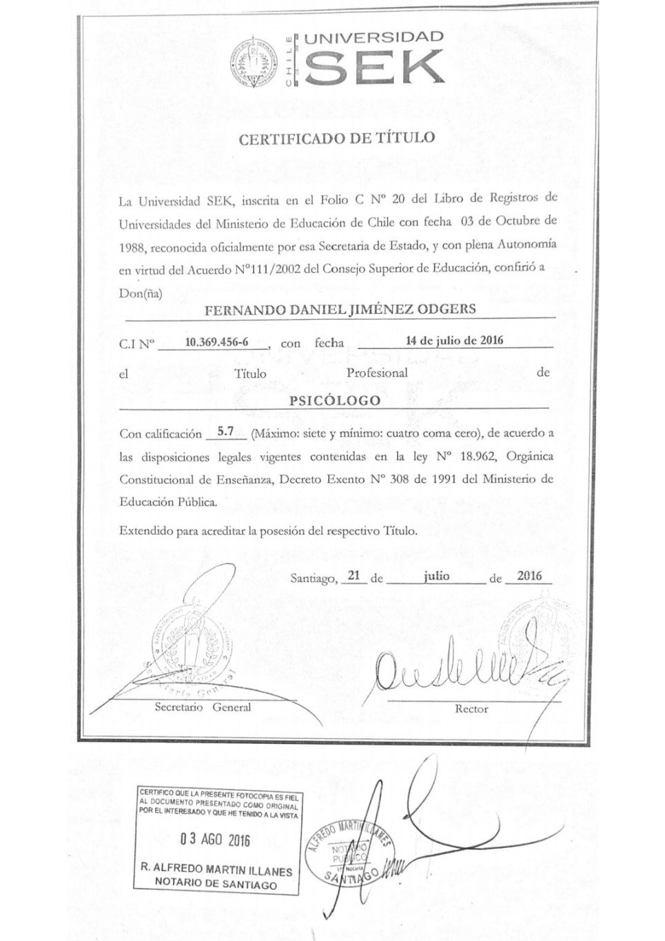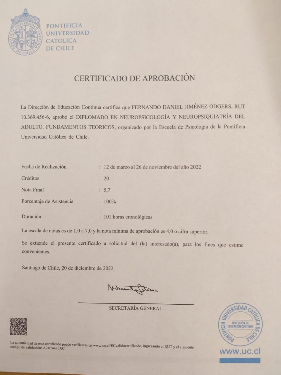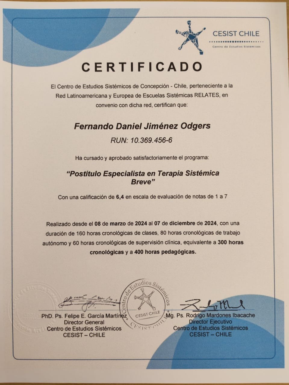 [ INFO en TELEGRAM: +1 (305) 404-3039 ] ó WHATSAPP: +56 (9) 61- 71-70- 78 ] Fernando es un Psicólogo profesional con una sólida formación clínica y una trayectoria marcada por la actualización constante. Se especializa en Terapia Cognitivo-Conductual, enfoque orientado a comprender y modificar pensamientos y conductas que generan malestar emocional. También en Terapia Sistémica Breve, metodología que aborda los vínculos y dinámicas relacionales para promover cambios en menos tiempo. Cuenta con una amplia formación en trastornos de la personalidad y en prevención del suicidio, áreas en las que combino herramientas clínicas y estrategias de intervención temprana. Además, tiene interés por la relación entre mente y cerebro, lo que me ha llevado a especializarse en Neuropsicología y Neuropsiquiatría de Adultos, integrando la comprensión del funcionamiento cerebral con el acompañamiento psicológico. Asiste de manera continua a cursos de actualización y formación avanzada, lo que le permite mantener una práctica moderna, ética y fundamentada en la evidencia científica.
