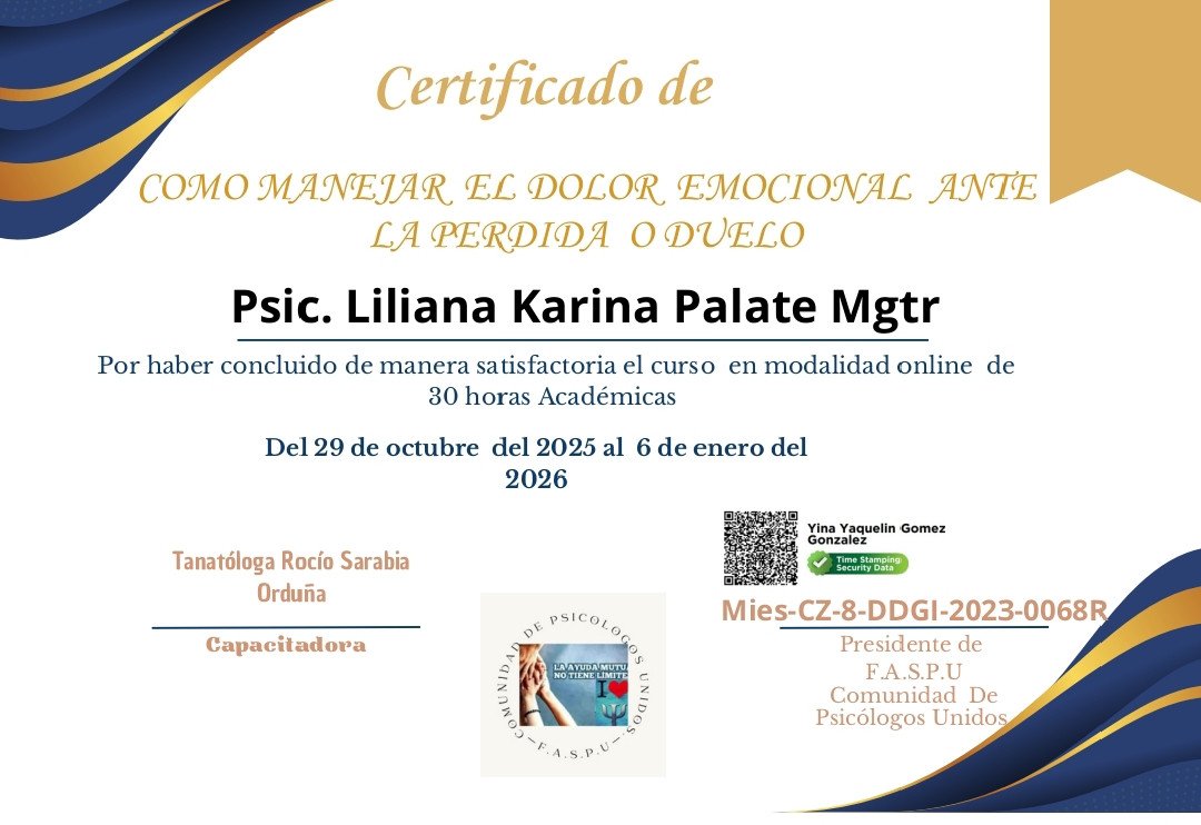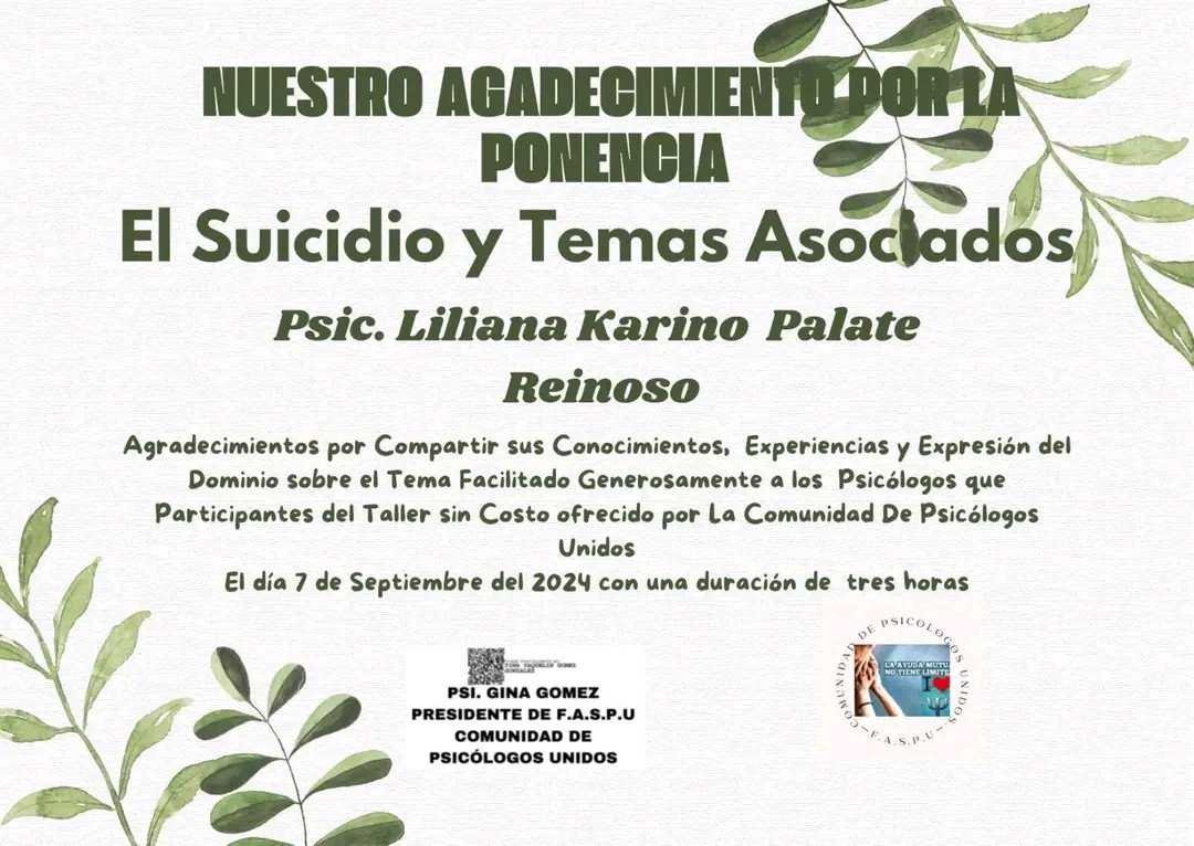 Soy Ponente Nacional e Internacional en temas de Conducta Suicida, Supervivientes en suicidio, Cutting, Duelos, Cuidado y Autocuidado, Resiliencia, Ansiedad, Estrés, Primeros Auxilios Psicológicos, autoestima entre otros temas, en Guayaquil y colindantes. Tanto On-line como presencial. Además pertenezco al Consejo General de la Psicología de España en calidad de MAI como Miembro Asociado Internacional núm. AI00306 tras su aprobación por la Junta de Gobierno del COP, celebrada los días 7 y 8 de febrero de 2025, formo parte de la Asociación "Després del Suïcidi — Associació de Supervivents (DSAS)" que es una Asociación formada por supervivientes y para supervivientes. También soy parte del Equipo de Psicotrauma de la Federación de Psicólogos clínicos de Guayaquil. Trabajo como Consejera Estudiantil en Ministerio de Educación con Comunidad Educativa. Si estás atravesando un momento de crisis emocional, ansiedad, duelo o ideación suicida, y buscas un espacio profesional, ético y confidencial, estaré disponible para acompañarte de manera respetuosa y comprometida en tu proceso de bienestar.