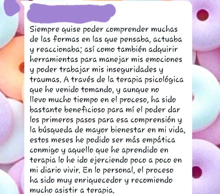 Lo que hace especial mi consulta es el equilibrio entre una profunda sensibilidad humana y una estructura terapéutica sólida. Entiendo que cada proceso es único, por lo que trabajo respetando siempre tu ritmo, pero asegurándome de que cada sesión te aporte claridad a través del análisis y la introspección. Mi objetivo es que no solo te sientas escuchada y validada, sino que te lleves herramientas tangibles para tu día a día. Por eso, mi acompañamiento trasciende la sesión individual mediante: Canal de herramientas exclusivas: Cuento con un espacio en Telegram donde comparto retos, ejercicios prácticos, lecturas seleccionadas, capítulos de podcast y videos diseñados para complementar tu trabajo personal fuera de consulta. Material de apoyo y bonos: Recibirás material extra y bonos específicos que te permiten profundizar en tu proceso con autonomía. Recursos de autoría propia: Integro herramientas que he desarrollado, como mi cuaderno de tareas y el e-book "El algoritmo del merecimiento", para que integres los cambios de manera responsable y consciente.
