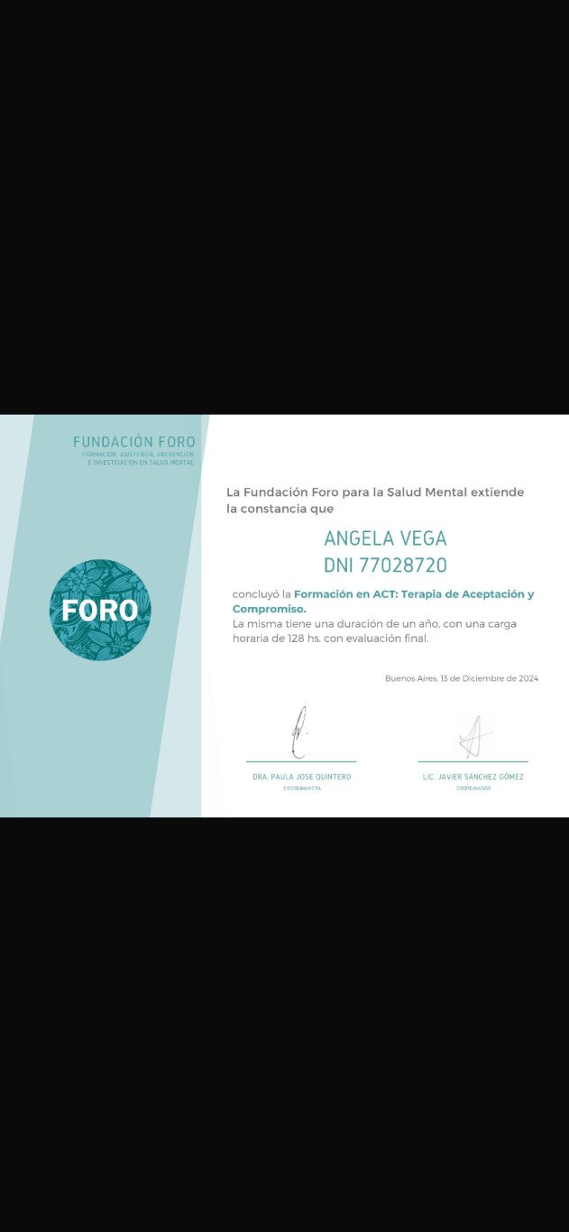 (Therapy in Spanish/English) Soy Ángela, psicóloga clínica y acompaño procesos terapéuticos desde un enfoque profundo, humano y respetuoso. Mi formación está basada en el modelo cognitivo-conductual y cuento con especialización en Terapia de Aceptación y Compromiso (ACT), formada en Fundación Foro, Argentina. Estos estudios, junto con mi desarrollo profesional, me han permitido construir una base sólida desde la cual acompaño cada proceso con sensibilidad, criterio clínico y una mirada integradora centrada en la persona. Mi enfoque se basa en la Terapia de Aceptación y Compromiso (ACT), desde donde no busco eliminar el malestar, sino transformar la relación que tienes con lo que sientes y piensas. Acompaño a que puedas sostener tu experiencia interna con mayor flexibilidad, sin tener que luchar constantemente contigo. Integro también herramientas como mindfulness, escritura terapéutica y recursos creativos, que permiten acceder a niveles más profundos de la experiencia, más allá de lo únicamente racional.
