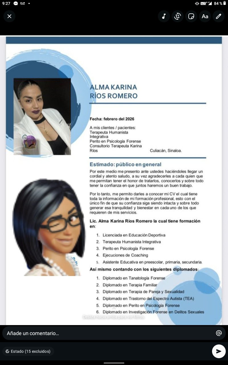 Hola mi nombre es Karina Ríos y soy Terapeuta Humanista, Perito en Psicología Forense, Asistente Educativa, Coach de vida. Así como también trabajo con diversos trastornos, duelo, conductas disruptivas en distintas edades desde lo 6 a los 65 años y más. Soy una profesional la cual se compromete con su trabajo y vocación para darte un mejor resultado, siempre dándole la opción de elegir a mis pacientes. Actualmente sigo en constante actualización profesional para dar un mejor servicio a toda aquella persona que necesite de nuestros servicios.